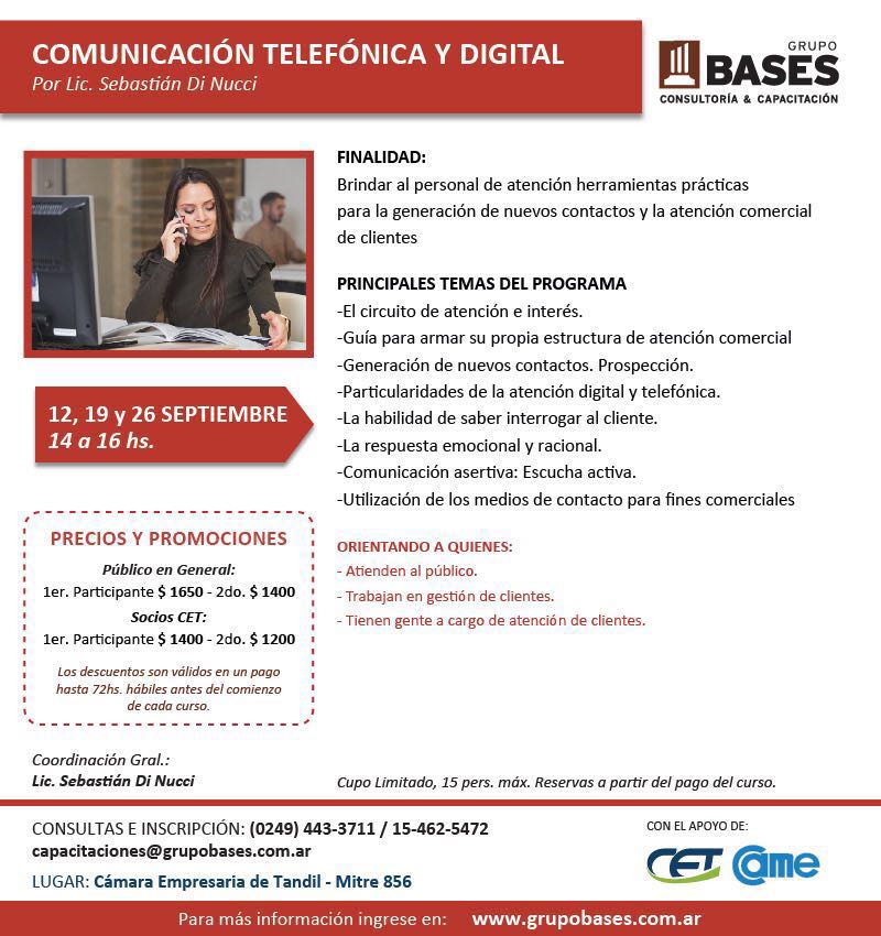 Comunicación telefónica y digital: "Finalidad: Brindar al personal de atención herramientas prácticas para la generación de nuevos contactos y la atención comercial de clientes"