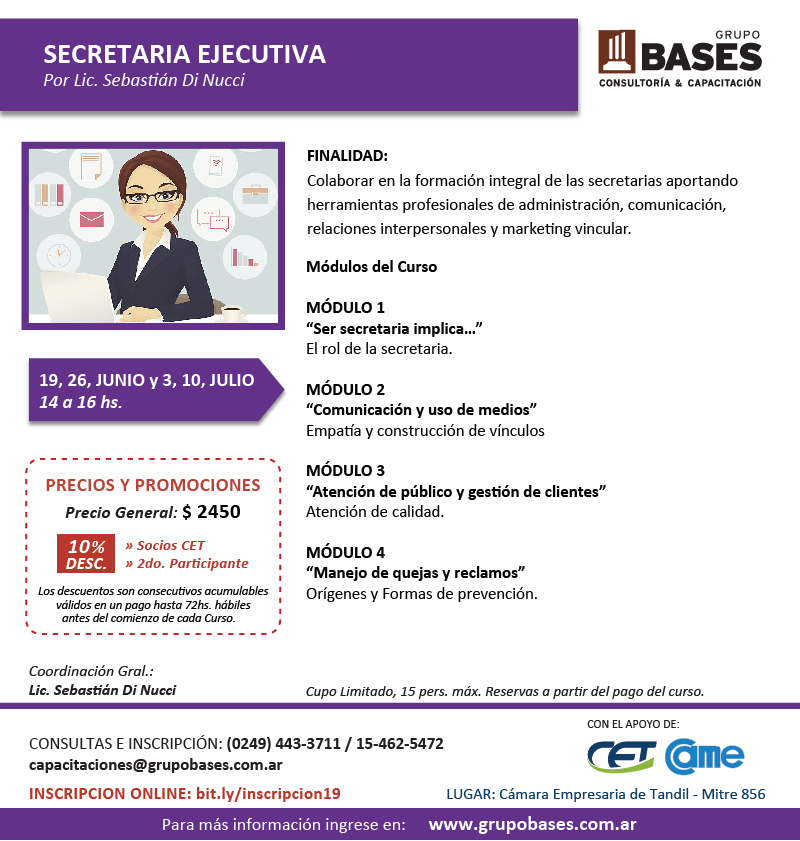 Se dictarán tres Módulos independientes que el participante optará integrar de acuerdo a sus necesidades. La Empresa o Particular tendrá un menor precio al tomarlo completo. Es dictado por Lic. Claudio Amitrano, Especialista en Recursos Humanos, oriundo de la ciudad de Bs.As.
